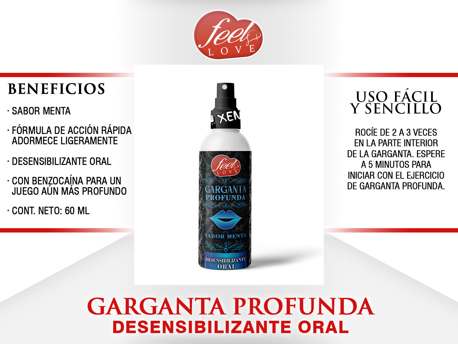 INSTRUCCIONES: Rocíe de 2 a 3 veces en la parte interior de la garganta. Espere 5 minutos para iniciar el ejercicio de garganta profunda.