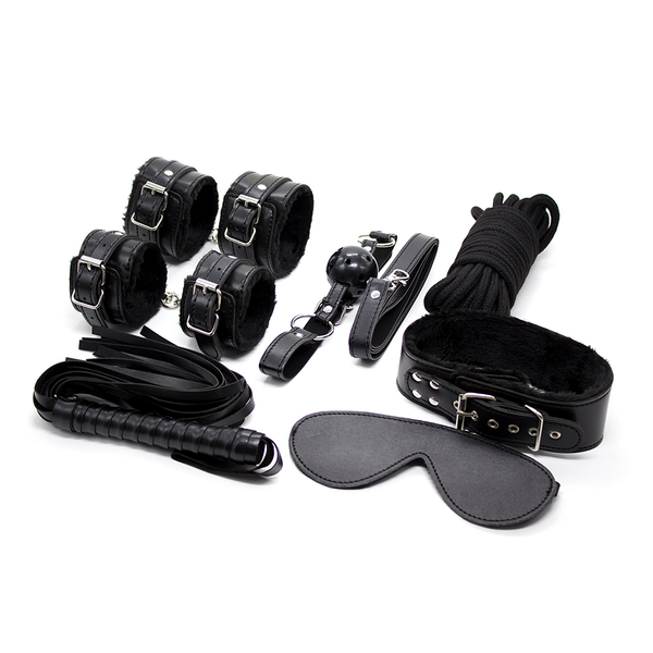 El kit incluye un antifaz, un collar con tira de sujeción, dos pares de esposas para muñecas y tobillos, una mordaza, un látigo y una cuerda de restricción.